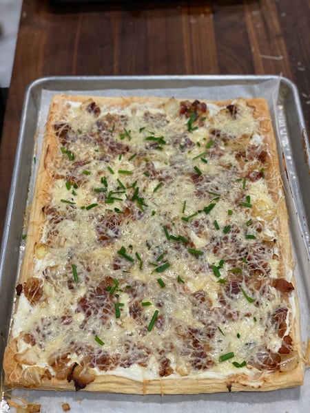 The filling contains ricotta cheese, sour cream and truffle. Then in a sauté pan, you crisp up bacon and caramelize onions. You then add all of these individual components together. You spread the cheese/sour cream mixture over the baked puff pastry. Scatter the bacon and onion mixture on top, and sprinkle with the Parmesan cheese. You then bake this all together until the top begins to lightly brown. Once out of the oven, cut the tart into squares. Place on a platter, and sprinkle with a pinch of truffle salt and garnish with a sprinkling of chives. This dish is meant to be served warm!