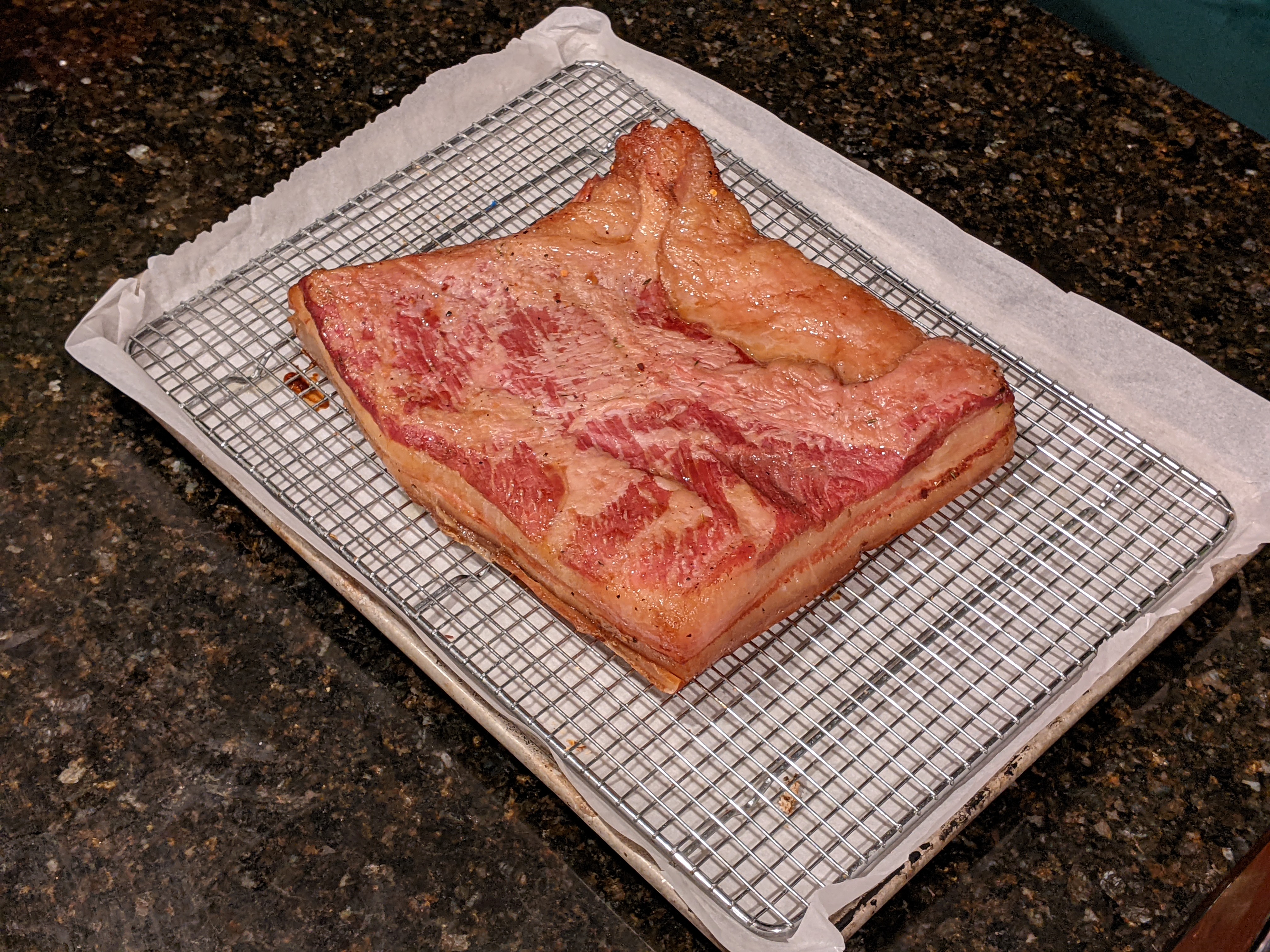 Preheat the oven or smoker to 225°F. It's best to cook the bacon on a wire rack over a sheet tray but it's okay if you don't have one. Bake or smoke the bacon until it reaches an internal temperature of 145°. For me that took about 2.5 hours. If you'd like more smoke you can start it at 180°. I included a full teaspoon of hickory liquid smoke in my cure because I don't have a smoker. Let the finished bacon fully cool in the refrigerator before carefully removing the skin by tearing or cutting with a small knife.