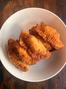 12. Slowly lower in the empanadas into the oil and cook until bubbly and golden brown. You should be able to do 2-3 at a time depending on the size of your pot, but be careful not to overcrowd. I recommend using a slotted spoon or spider to lower and remove them.