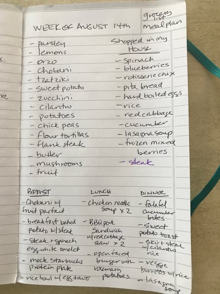 Here was my grocery list and meal plan, along with the items I wrote down that I “shopped” for in my house before coming up with my meal plan.