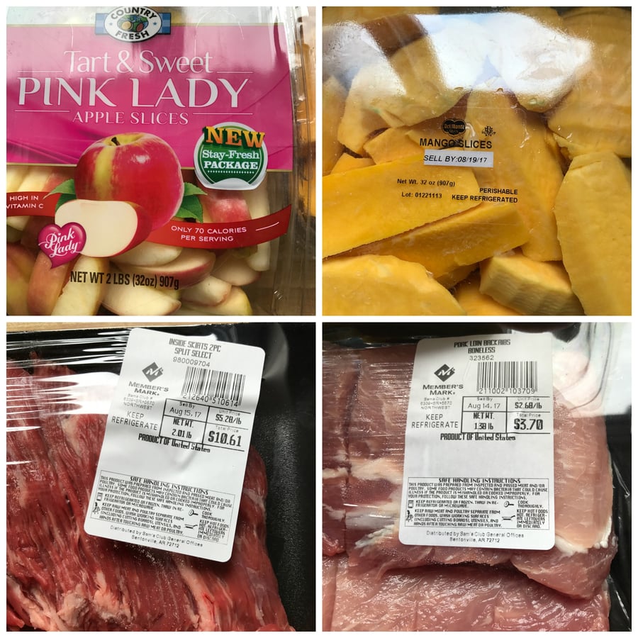 This week I spent $51.35. $25.08 on 90% of my grocery list at Walmart, and $26.27 at Sam’s Club on skirt steak, pork, mango and sliced apples.
