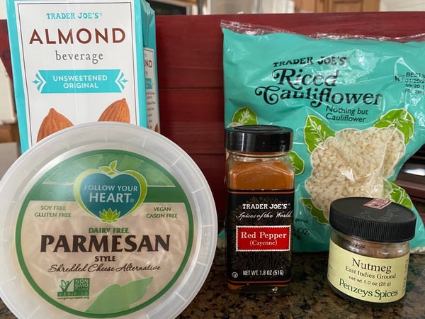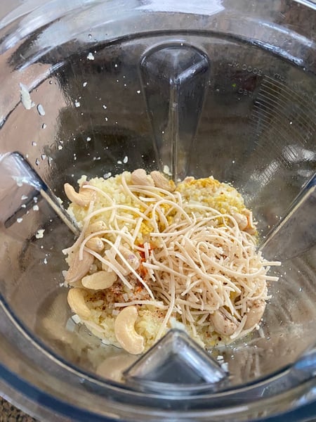 - 2 Tablespoons nutritional yeast (usually found in bulk aisle of Whole Foods, or online at Amazon, Target, etc.) It mimics some of the salty umami of Parmesan.