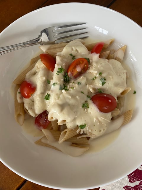 So with that in mind, I have created a yummy creamy alfredo-style sauce I hope you will try – it comes together very quickly and freezes well for up to a month. My husband loves it over zoodles (zucchini noodles), and this week, I am going to make a veggie pot pie using it as the sauce.