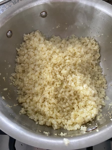 1. Over medium heat, place pot with riced cauliflower and 2 Tablespoons of water – top with tight fitting lid. Steam for 3-5 minutes, just until cauliflower becomes translucent, and water evaporates. You may have to stir once.