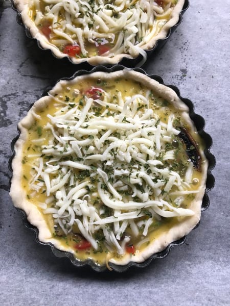 - Sauté 2 cups of mixed veggies and let cool. Take the tart pans out of the fridge, and place 1/2 cup of the veggies into each pan, top with one egg (I scrambled mine, but you could leave it just cracked with the yolk not broken if you like it like that), top each mini quiche with 1/8 cup mozzarella cheese and bake on a baking sheet for 30 minutes.