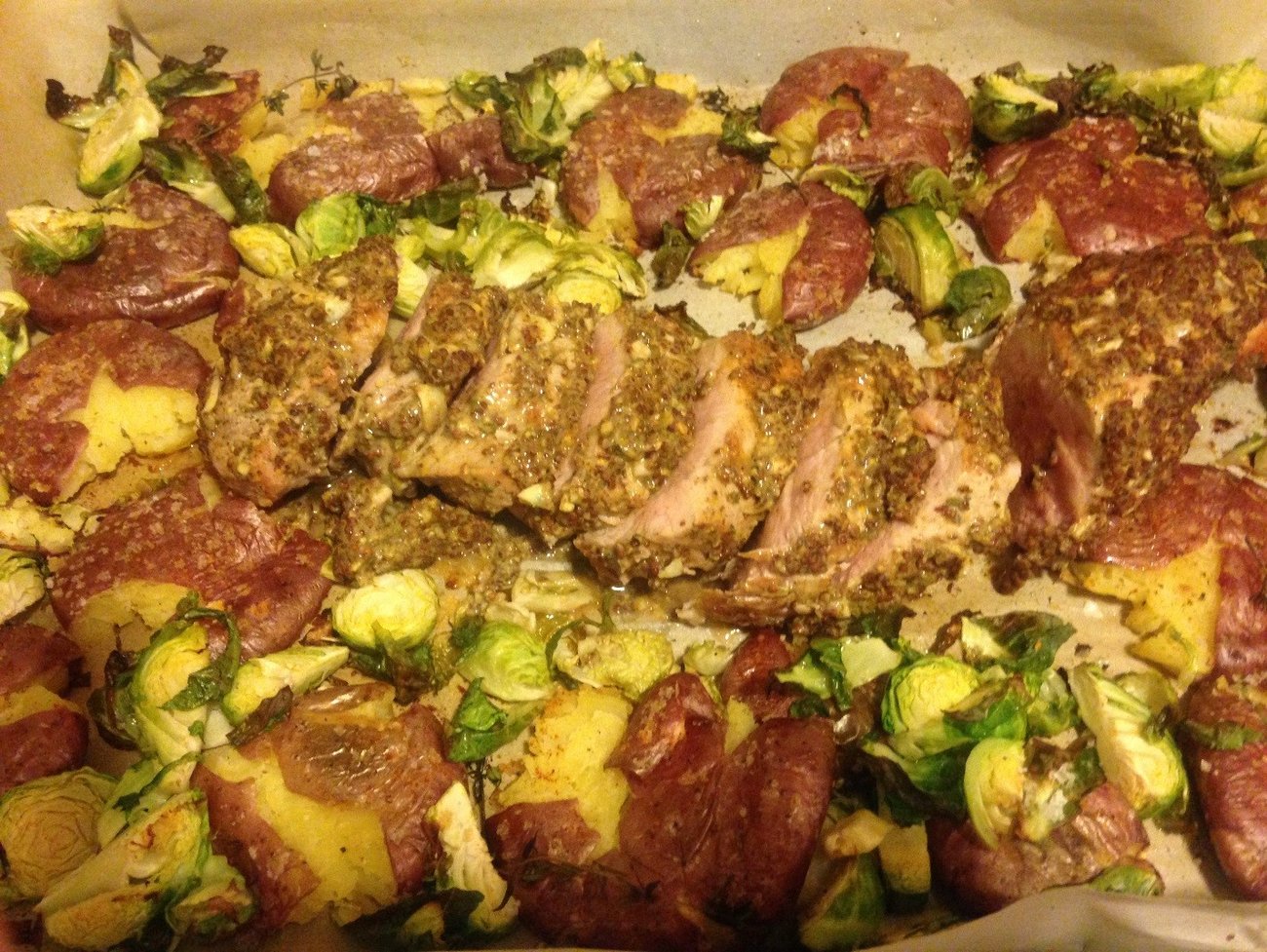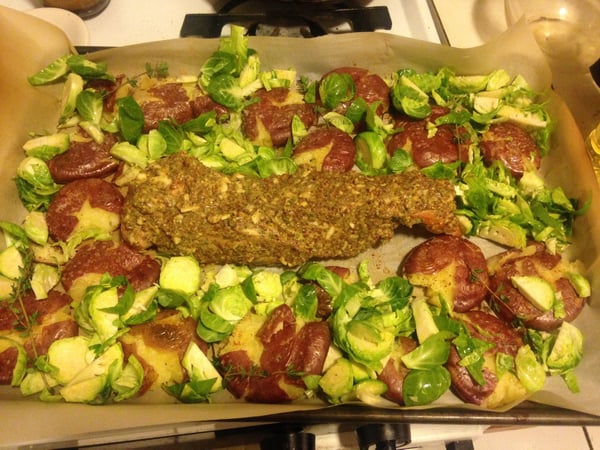 Now place all of your potatoes around the outside on your pan, place your pork in the center and shred some Brussels sprouts. And back into the oven the pan goes!