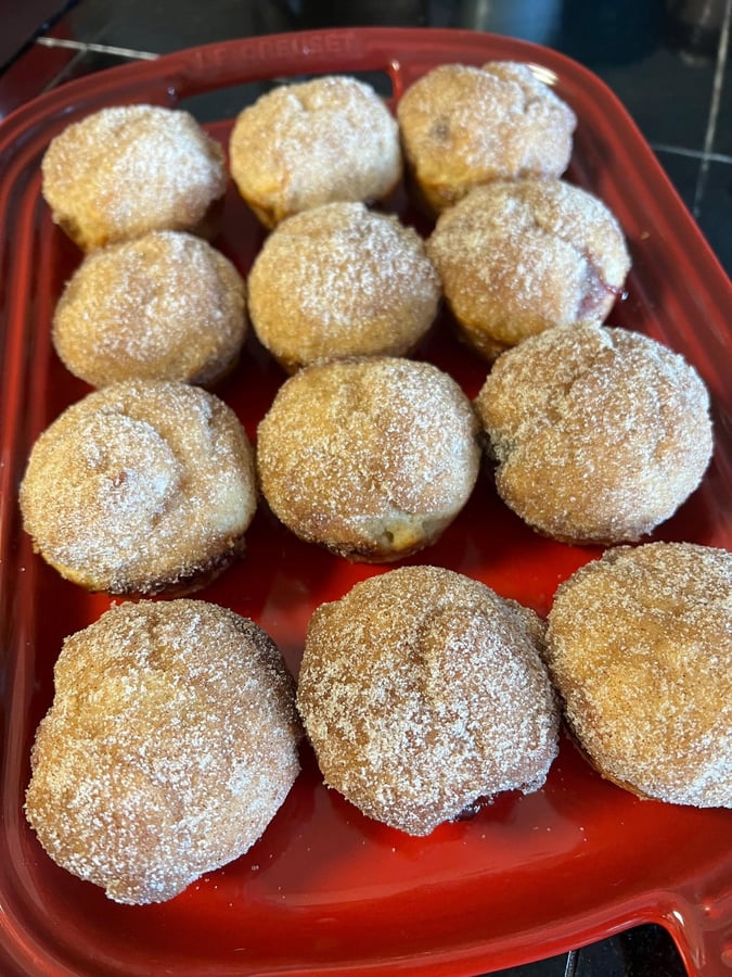 - Shake the muffins out of the tin immediately and while hot, dip the tops in melted butter and then the cinnamon sugar.
