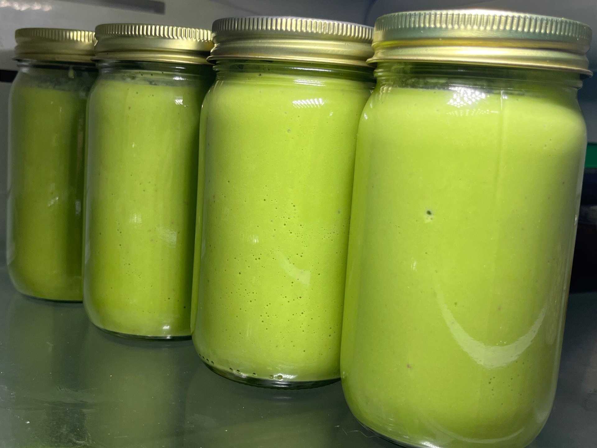 The production of a smoothie is a very simple process: first you gather the ingredients, blend them until smooth and portion into jars to store for the coming days. I make a batch of five to six smoothies in my blender at a time, and they will last five to six days in your fridge. In the event you do not have a 2-quart blender top like I have, you can cut this recipe in half to make a smaller amount or blend it in two to three batches, then combine it all together to check the consistency and seasoning, adjust as needed, and ration into jars for storage.