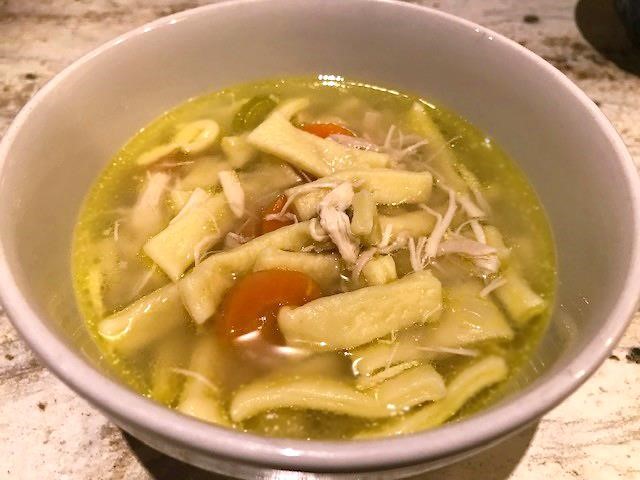 I made a broth using filtered water, aromatics, a whole chicken and some salt. After simmering for a couple of hours, I carefully removed the chicken, strained and discarded the aromatics out of the broth, and set everything in the fridge to cool down. After cooling, I removed the meat from the carcass and placed it back into a bowl with a little broth to keep it from drying out. I was able to reserve enough broth to make a full batch of soup. Another plus, because I stewed my chicken with the herbs and aromatics, my broth already had all of the flavor and health benefits, so I didn’t need to add more into the soup – resulting in a beautifully clear broth.
