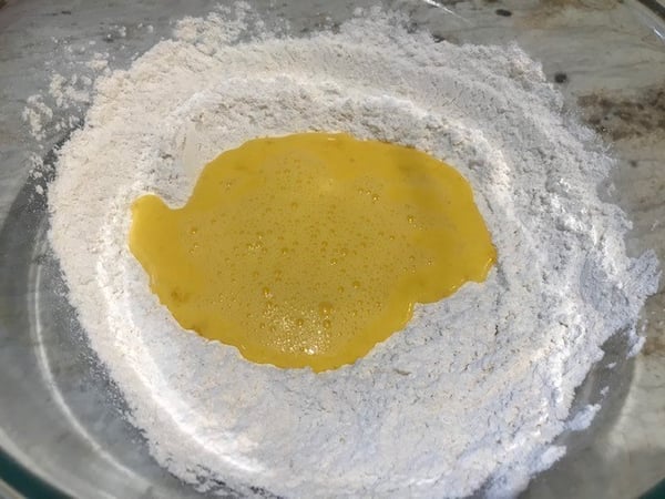 - In a bowl, mix dry ingredients together. Make a well in the center.