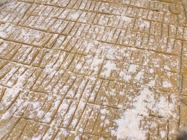 6. Using a knife, pasta cutter, or pizza cutter, cut into noodles, about 1/4” X 1-1/2”.