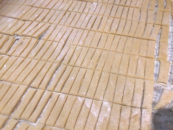 - Using a knife, pasta cutter, or pizza cutter, cut into noodles, about 1/4” X 1-1/2”