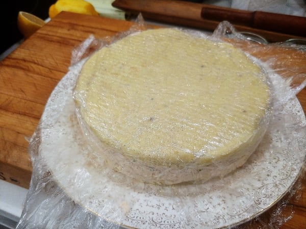 As you could see, when I was done, I just folded in the overhanging plastic wrap over the last crêpe, gave the cake a little press, and placed a sturdy plate on top just to keep a bit of pressure on it. It then needed to chill so it would be easier to spread the icing. Well, with our move, absolutely nothing has happened on schedule, and I got a late start making this cake – yet we wanted to be sure to enjoy it while it was still my birthday. So instead of the refrigerator, I placed the cake in the freezer for about 45 minutes; I figured between the plastic wrap and that heavy cake pan, nothing was going to completely freeze in that time. And it didn’t – it just came out firmed up and ready to ice. I opened up the plastic wrap and turned the pan upside down on a pretty plate.