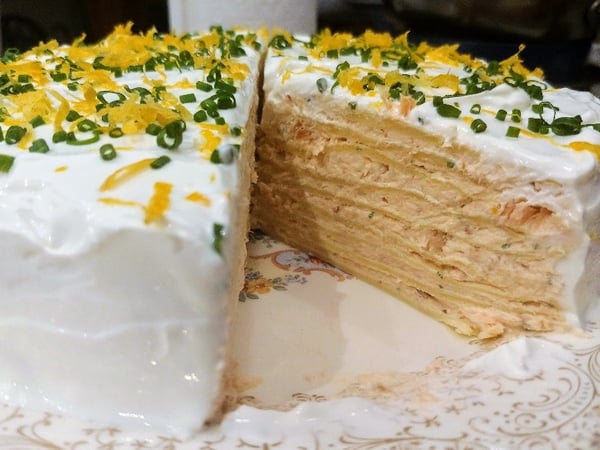 Funny – I think I ended up with one “sweet” cake! And just in case anyone is counting, I used nine crêpes in all. While I was assembling it, I got so excited that it was all coming together I lost count when I was shooting the video!