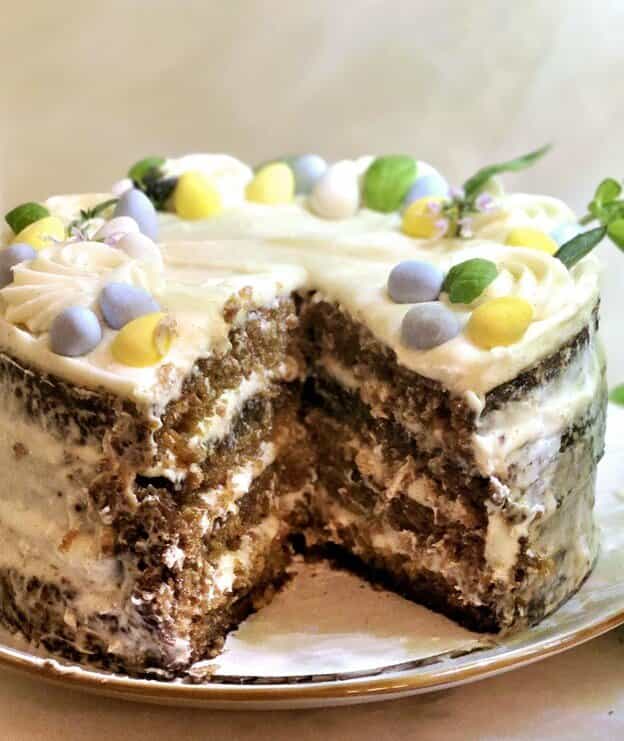 15. Assemble on a cake board or serving plate, put the first layer of cake down, followed by a layer of cream cheese frosting. Repeat for the next 2 layers. Place the final layer of cake on and frost the outside in a light layer of frosting. (this is a rustic looking cake) decorate however you would like and top with extra nuts or decor of your choice.