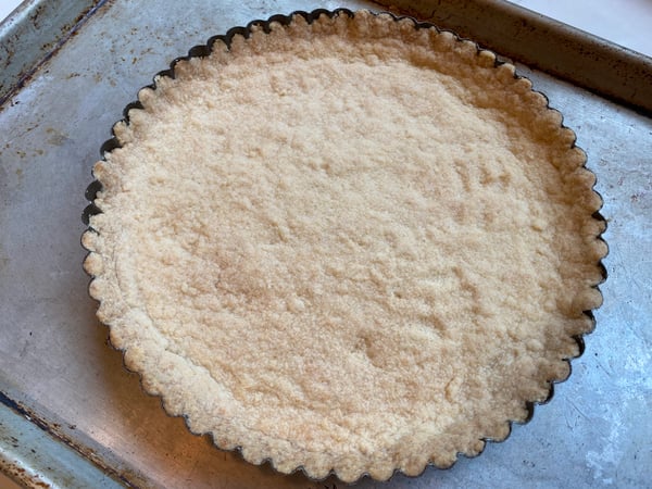 - Place the tart pan on a sheet tray, and bake for 25 to 30 minutes, or until the crust is golden brown. Allow to cool.