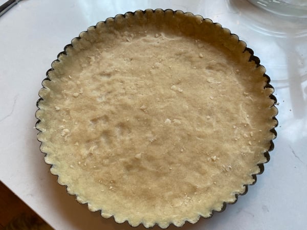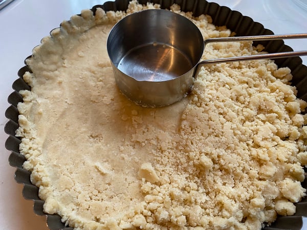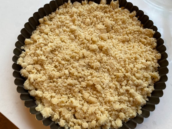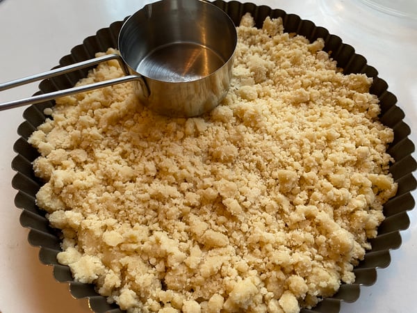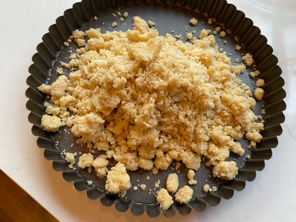Pour the pastry into your tart pan with a removable bottom, evenly distribute the crumbles, and use your hands or the flat bottom of a measuring cup, to press the pastry on the bottom and up the sides of the pan.