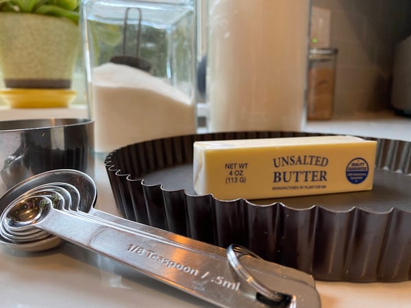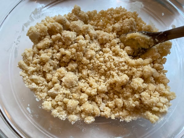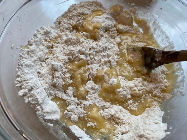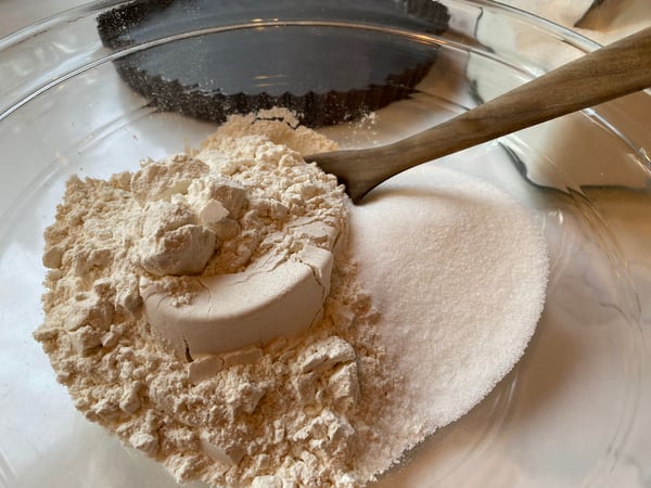 For this dessert, I like to use what’s called a hot butter pastry tart. Warm, melted butter is poured into your dry ingredients (flour, sugar and salt) and is then mixed until all of the ingredients have been incorporated. It will still look a bit crumbly, but I promise it will be easy to work with.