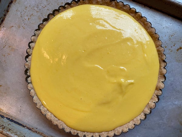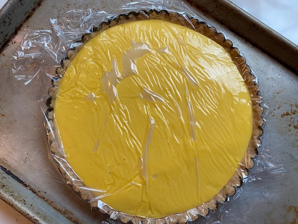 - Pour the curd into the baked tart shell, cover with plastic so it's directly laying on top the curd. This will prevent a skin from forming.