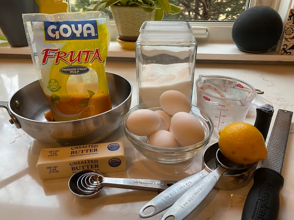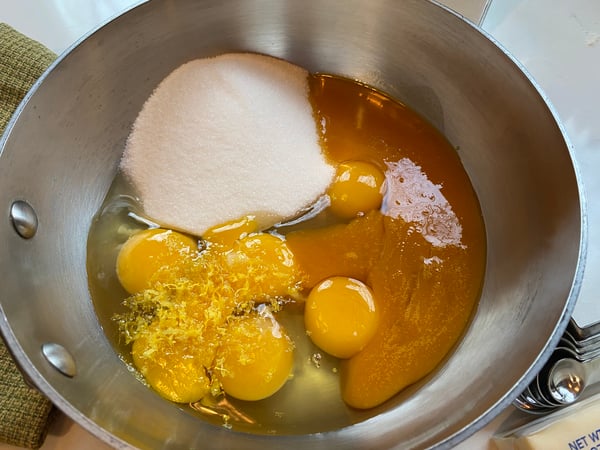 - Once the tart shell has cooled, prepare the curd. Combine the whole eggs, yolks, sugar, passion fruit pulp and zest in a heavy saucepan, and whisk to combine.