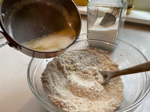 - In a medium-size bowl, mix together the flour, sugar, salt and melted butter until thoroughly combined.