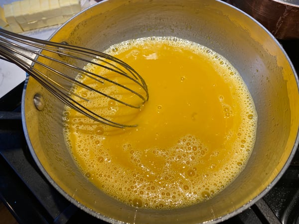 The ingredients are whisked together over medium-low heat, and are cooked until the eggs gently thicken the mixture.