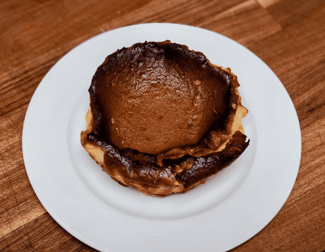 One of our chefs, Quincy Bissic, has developed a Basque cheesecake recipe that is very tasty. Traditionally, a Basque cheesecake is baked in a large 9-to-10-inch springform pan and can take up to an hour to bake. If you are not familiar with this particular style of cheesecake, it is basically the exact opposite of our New York-style cheesecake or other American variations.