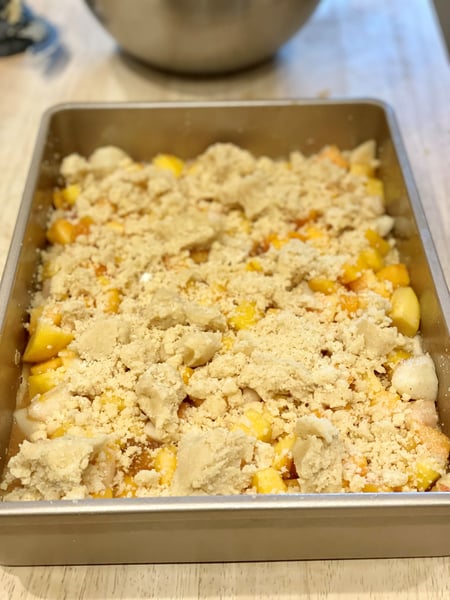 2. Using your hands, press together handfuls of the remaining crumb topping to create clumps. Scatter the clumps and remaining crumbled topping over the peaches, leaving some peaches showing through.