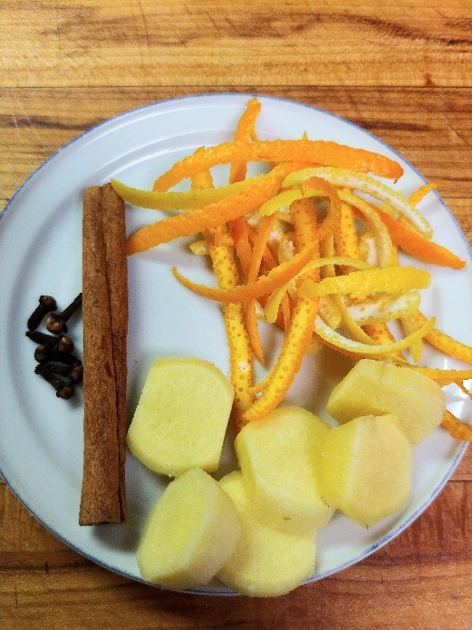 You don't need the juice this time, so save the fruit for another use. As you can see, you’re also going to add a cinnamon stick, 5 or 6 whole cloves and chunks of peeled ginger (from about a 2-inch piece of ginger). Once again, adjust your seasonings to your own personal taste.