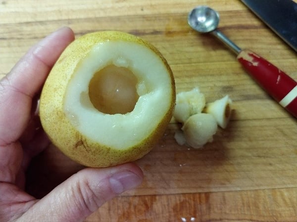 To core the pears, I go old-school and use a melon baller. You can see that this one has been around the block a few times! It was always on hand in my mother’s kitchen, and for tasks like this one, I’m always glad it made it into mine. If yours has a small and large scoop, use the smaller one. If you don’t have a melon-baller, use the smallest spoon you have. Comice pears are pretty soft, which makes this task fast and super-easy. Be sure that you are scooping out all the black seeds – you’ll see them and you’ll know when the job is done!