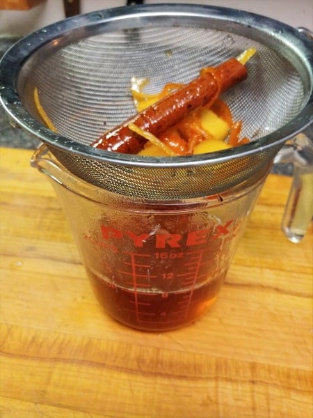 Meanwhile, set your poaching liquid to high heat. Once it starts to boil, let it go for about 30-35 minutes, until it is reduced and gets a bit syrupy. Pour the liquid through a strainer into a bowl or measuring cup.