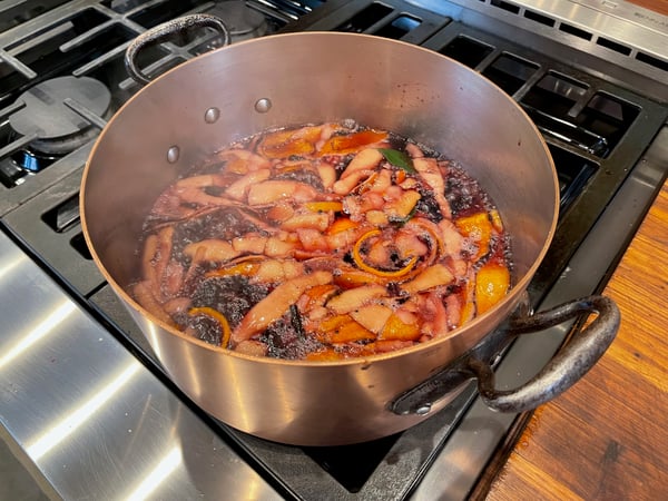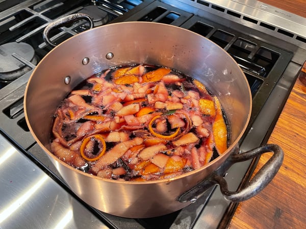 - Place sugar, cinnamon stick, vanilla bean, cloves, orange peel, bay leaf and wine into a 5.5 or 8-quart stock pot. Turn the burner to a medium heat and heat just until steam rises. Hold the poaching liquid at this temperature for 15 minutes so that the flavors of the spices infuse into the liquid.