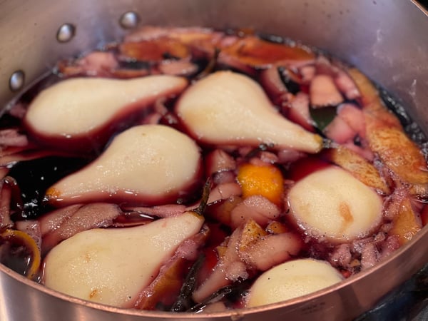 After the poaching liquid has steeped for at least 15 minutes, add the prepared pears to the liquid. Make sure to keep the poaching syrup just below a simmer.