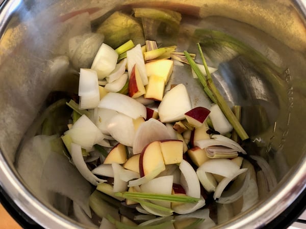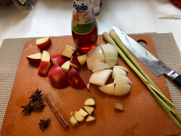 1. Cut the apple into chunks. Halve the large onion and cut into chunks. Cut ginger into chunks. Smash each piece of lemongrass with the side of a knife.