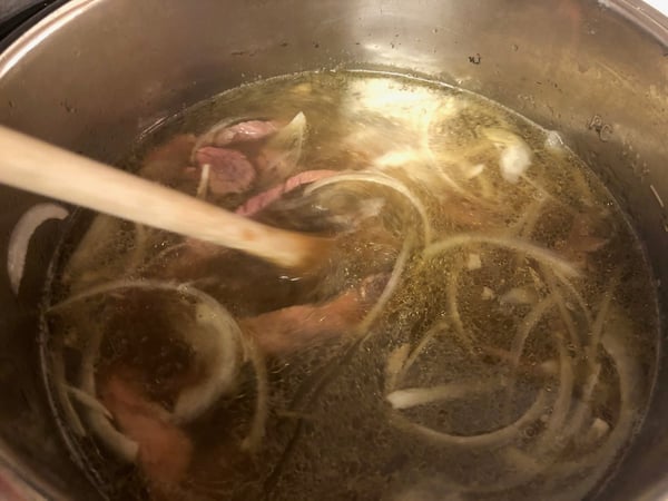 - Slice the beef very thinly across the grain and add to the broth with the sliced onion. The broth should be hot enough to cook the beef through as it sits in the broth. If not, turn on the Sauté function for a few minutes until the beef is cooked.