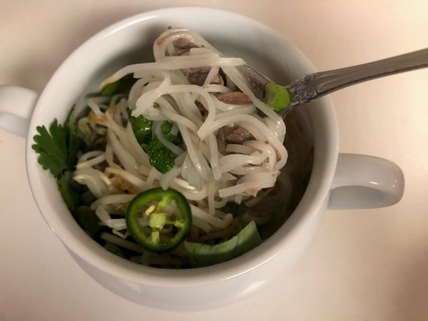 Pho is slow-simmered broth, typically prepared with beef bones, and served with rice noodles, protein (such as beef, chicken or plant-based protein) and toppings. The beef bones are simmered with spices like star anise, clove and cinnamon, which layer on the savory notes of the beef. It's typically simmered for at least 12 hours, and sometimes entire days.