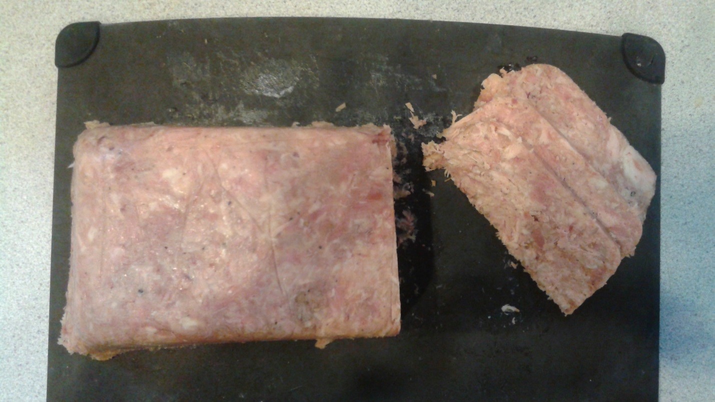 I picked through the meat and put the bones back in the pot with the stock to reduce it further and really develop the gelatin. I had to move to the same test you use when making jelly: keep a plate in the freezer and place a small amount of stock on it. Back in to the freezer it goes, and when it turns solid, you are done. This took about another hour. I seasoned it with salt and set it aside (reminder – as things chill, they lose seasoning, so it needs to taste a bit too salty). After that, I took the meat that I had picked, seasoned it with cumin, coriander, salt and pepper and used it to create the pate.