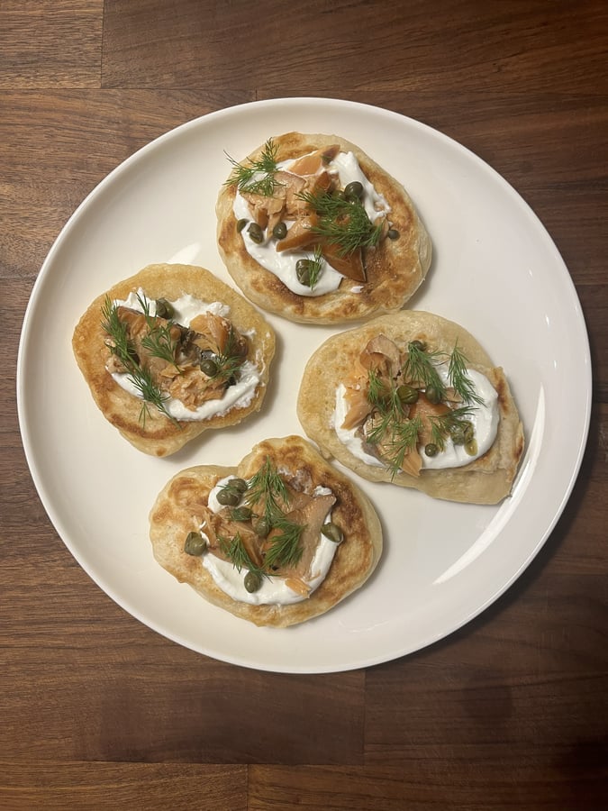 I also had a tin of smoked salmon in my cupboard. I have already written a blog about my fondness for tinned fish. I spread some yogurt on top of the pikelets, added some of the smokey salmon, a few capers, and some fresh dill. One of the best bites that I’ve had in a while. This dish could be a star appetizer at any dinner party.