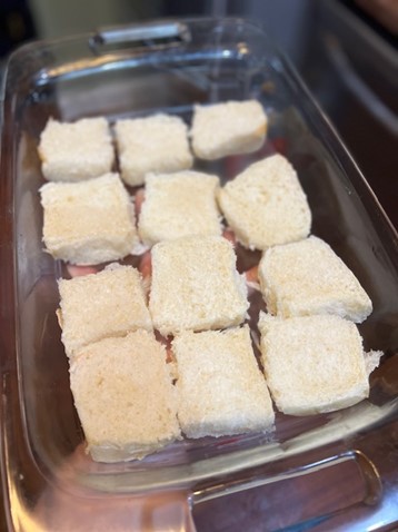 8. Slice the slider rolls and place them cut side up baking dish (the bottoms and tops will all be bottoms).