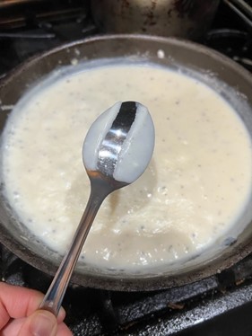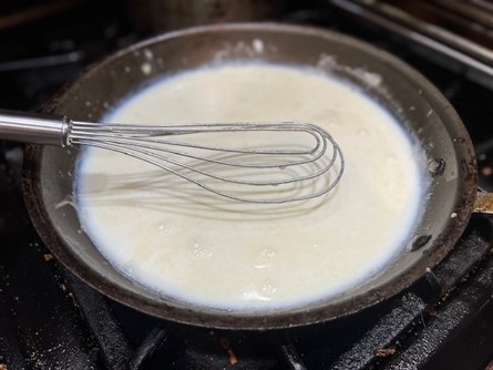 - Add the milk, whisk for 3-5 minutes until the liquid thickens . It will be nappe (or coat the back of a spoon).
