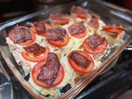 13. Top with Parmesan cheese, sliced tomato, bacon, and parsley/scallions.