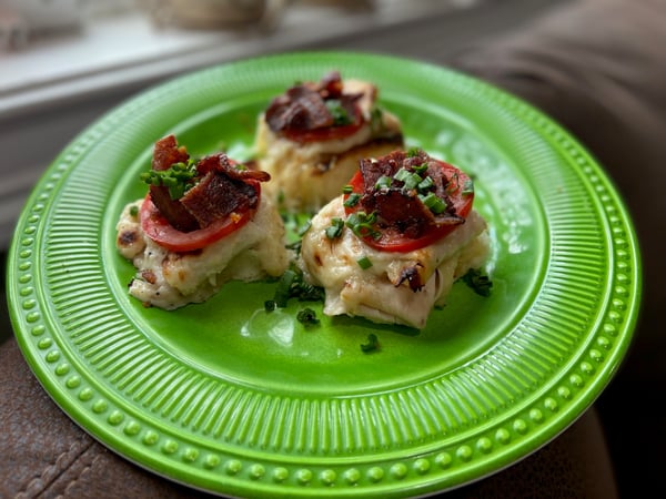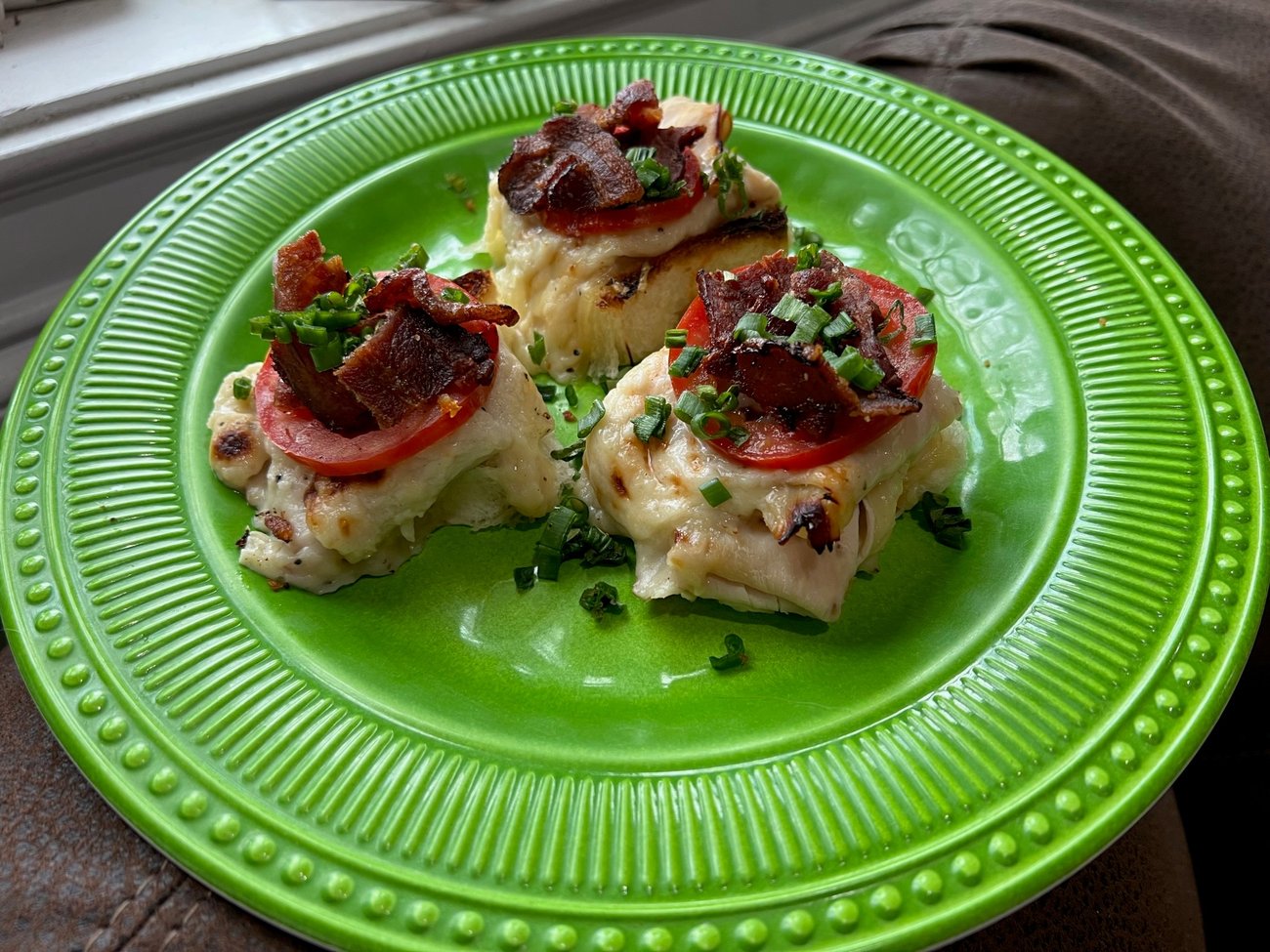 - Top with Parmesan cheese, sliced tomato, bacon, and parsley/scallions.