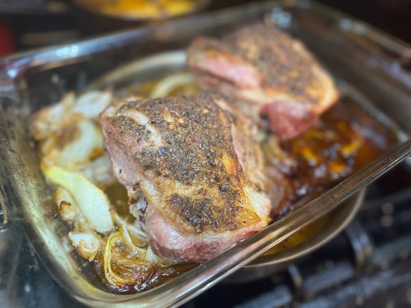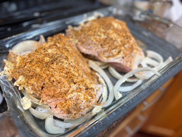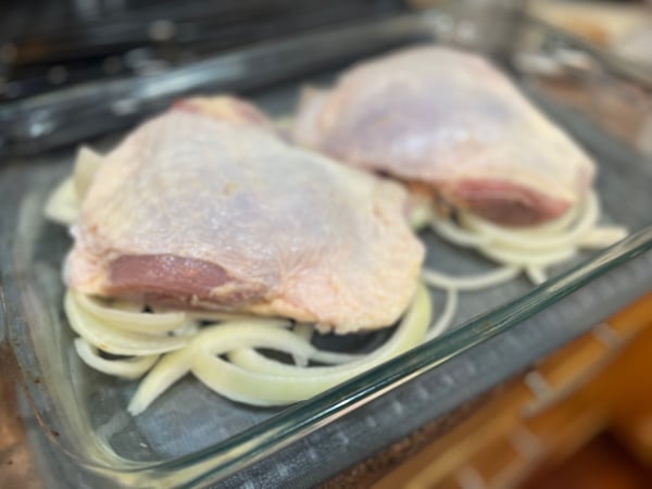 4. Place the thighs in a baking dish, on top of your sliced onions, and roast for 45 minutes, or until the internal temperature is 165 degrees.