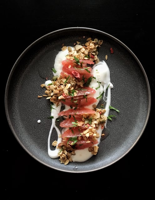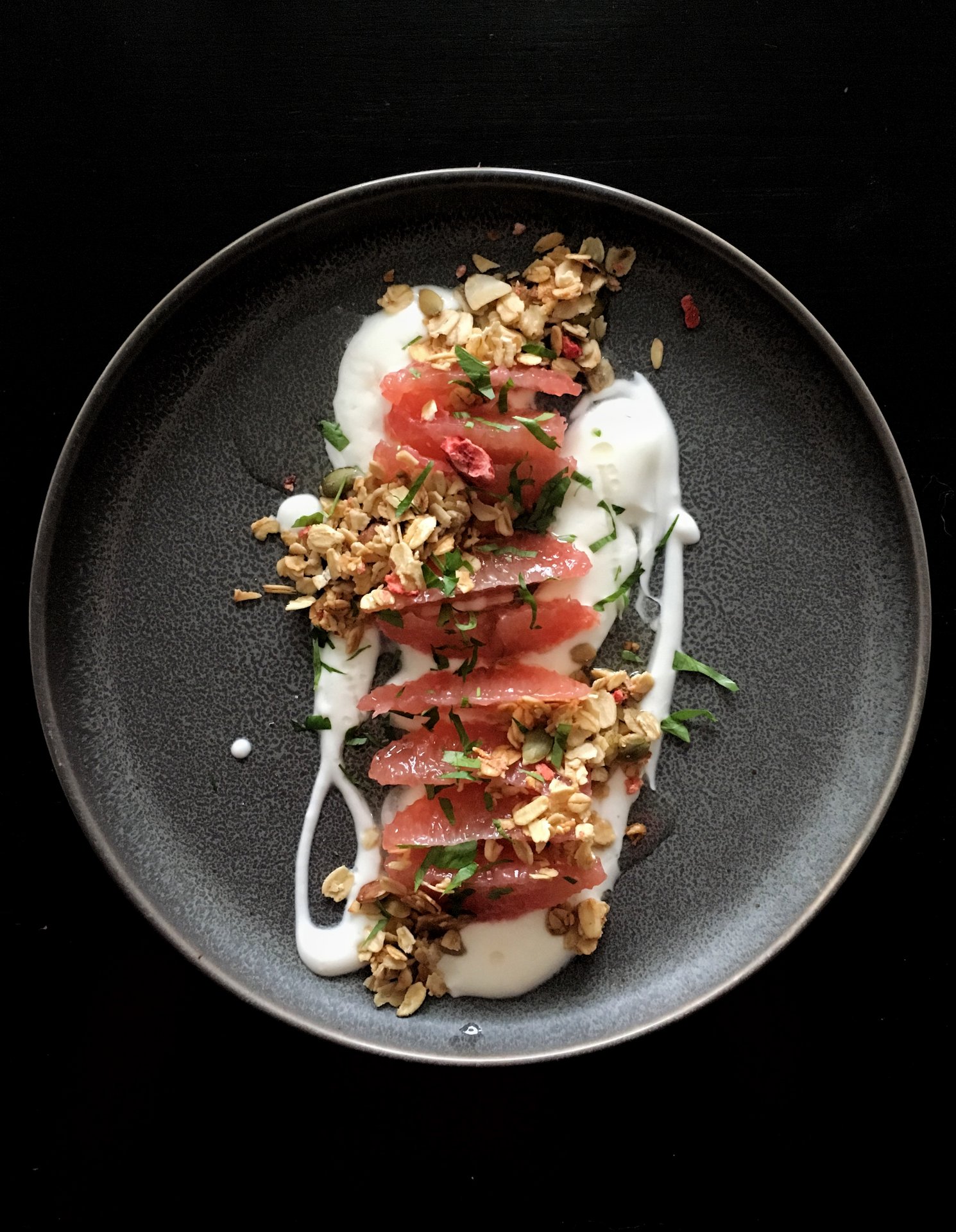 After you’ve freed all the flesh you can use it however you like: Eat it with a spoon, add a little life to a dish of roasted root vegetables, or do what I did and make a little breakfast-friendly take on granola and yogurt with the grapefruit as the star. I used a cream-top yogurt, some walnut oil, a little pinch of salt, some granola for crunch, and finished it off with a little chopped parsley (which actually works surprisingly great with citrus, but mint is a safe bet too if parsley makes you cock an eyebrow). If your grapefruit is truly ripe, it wont even need that white sugar people are so fond of caking the top of their healthy breakfast with.