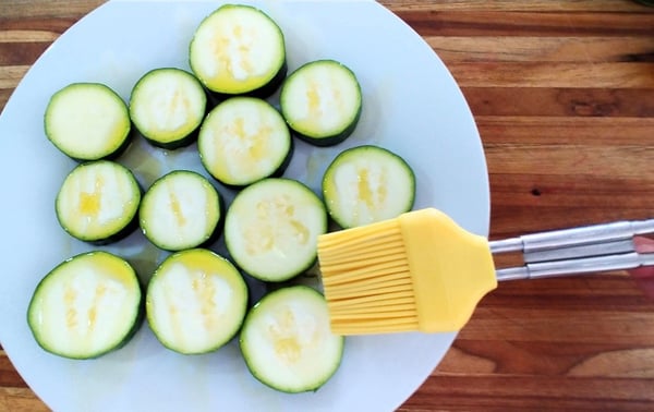 - Use the time the pan is heating up to slice the zucchini into half-inch rounds, setting them on a plate and brushing them with olive oil. I like to use a basting brush, but if you don’t have one, the back of a spoon will do just fine.