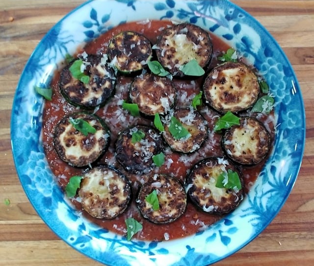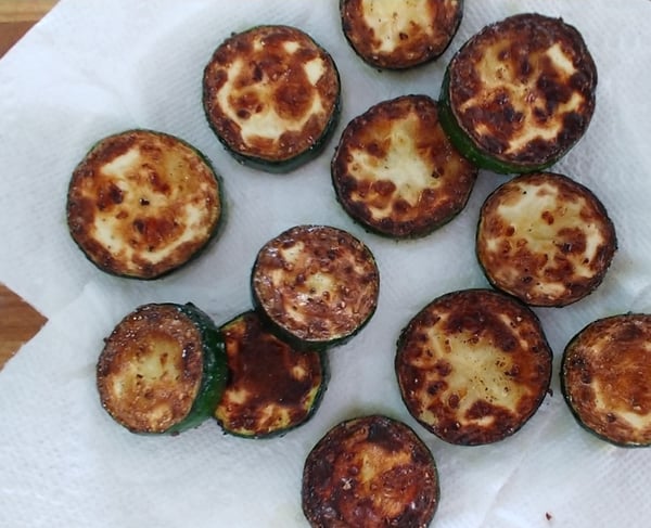 - After about 2 minutes, check the browning. Once dark enough for your taste, remove the zucchini rounds to your paper towel-lined plate. If you need to keep them warm while the rest of your meal finishes cooking, place them in a warm oven for about 15 minutes.
