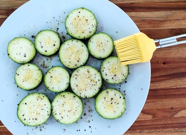 - Slice the zucchini into half-inch rounds, setting them on a plate and brushing them with olive oil.