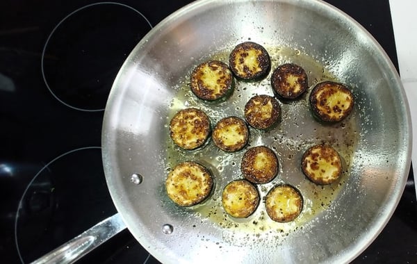 - Now add enough olive oil to your sauté pan for a light coating. It will only take about 30 seconds for it to heat up in the preheated pan. Add your zucchini rounds to the pan with the seasoned side down, making sure they are not touching one another. If you don’t hear a “sizzle” when you place the first round in, remove it and wait another couple of seconds. They will cook for about 4-5 minutes. When all the zucchini is in the pan, brush the tops of with a light coat of olive oil and season with salt and pepper (or other seasoning you may be using). Whenever I’m adding ingredients that will need to be flipped to a pan, I like to start at the handle and work my way around, so I know where I started and can flip them in the same order. Of course, this method doesn’t account for “hot spots” in your pan and the pieces may still cook at different rates – but at least you’ll have a benchmark of what’s happening! This video will show you what I mean: