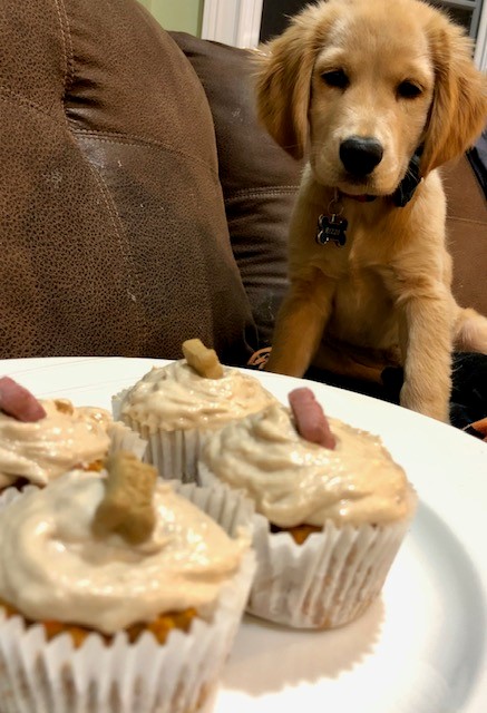 His name is Rizzo, and he’s an adorable 15-week-old Golden Retriever who runs my life, but I wouldn’t have it any other way. We make a great pair - I think he’s the best thing to happen to me during quarantine, and he thinks my Pumpkin-Peanut Butter-Banana Pupcakes are the best thing to happen to him!