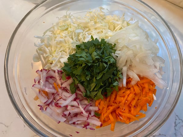 It’s best to make the curtido in advance so the flavors can blend, so you’ll ideally want to make the salad a few hours or a day ahead of time. The traditional curtido ingredients include shredded green cabbage, grated carrots, sliced onions and dried oregano all dressed with white wine vinegar and a touch of sugar. I added a julienne of radish and chopped cilantro for color and flavor, but you can also sneak in some jalapeño if you like it spicy.